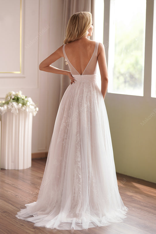 A-Line/Princess V-Neck Sweep Train Tulle Wedding Dress