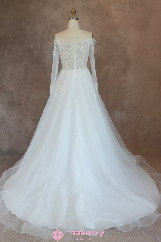 Romantic Floral Lace Beaded Bridal Gown With Long Sleeves