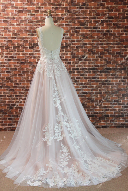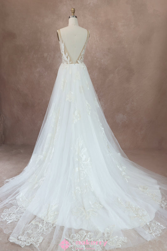 Long V-Neck Lace Appliques Sleeveless Wedding Dress