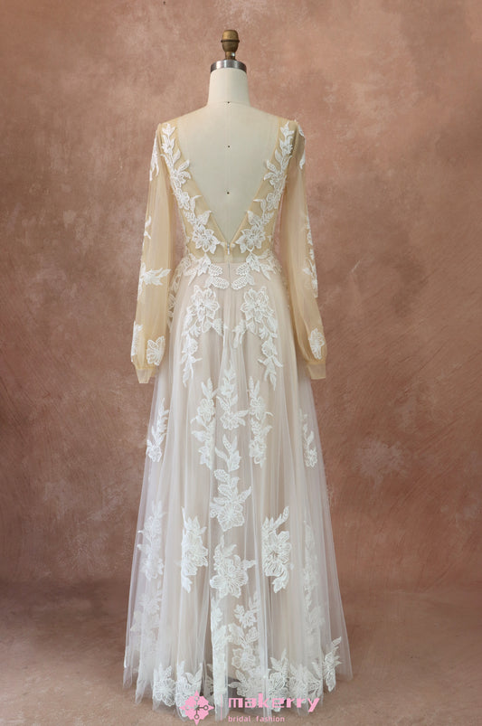 Romantic Boho Lace butterflies pattern Wedding Dress With Long Sleeves