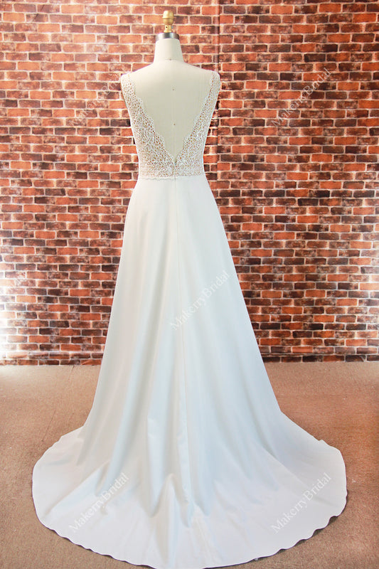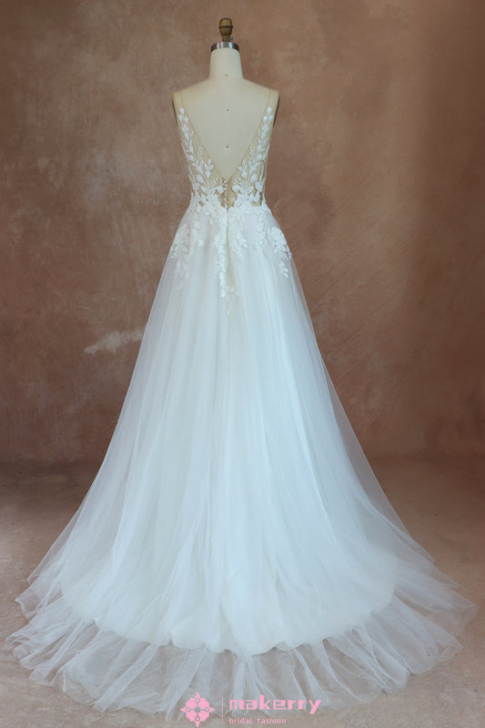 Beaded Tulle A-line wedding dress with a plunging V-back