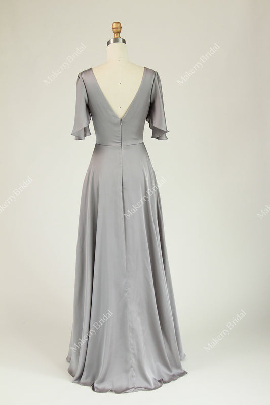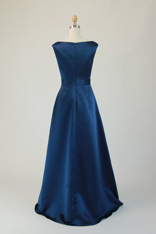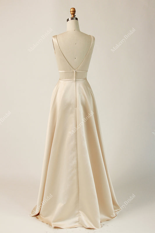 Satin V-neck Fitted Bodice Bridesmaid Dress With Double Banded Waistline