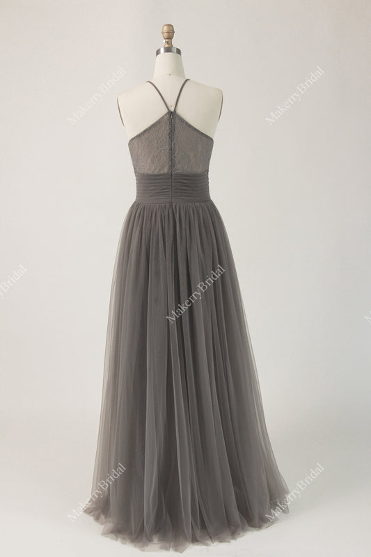 Lace Tulle Long Bridesmaid Dress with Halter Neckline