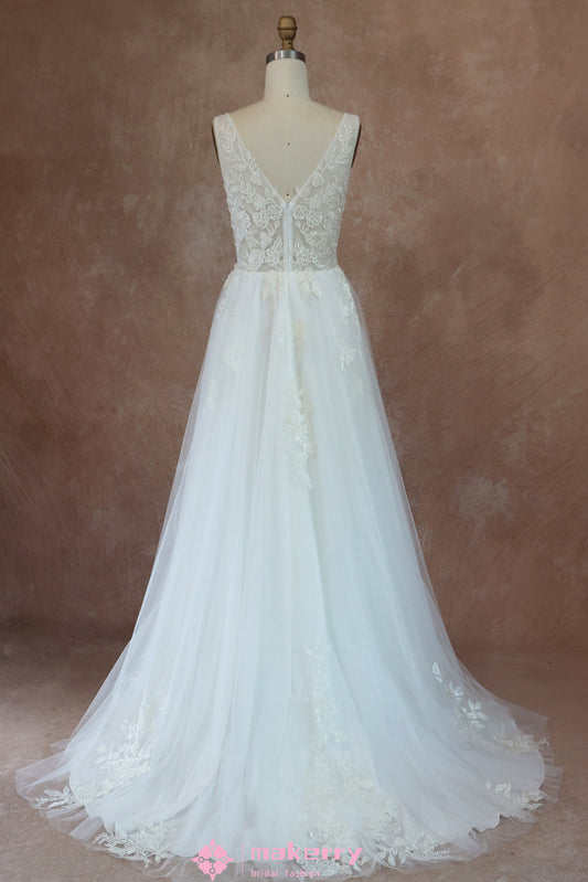 Long V-Neck Lace Appliques Sleeveless Wedding Dress
