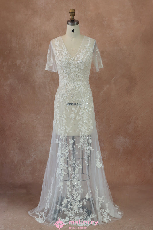Boho See Through Lace Wedding Dress With 3D beaded Flowers