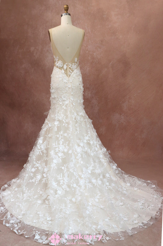 3D Flowers Lace Wedding Dress With Deep V-neckline