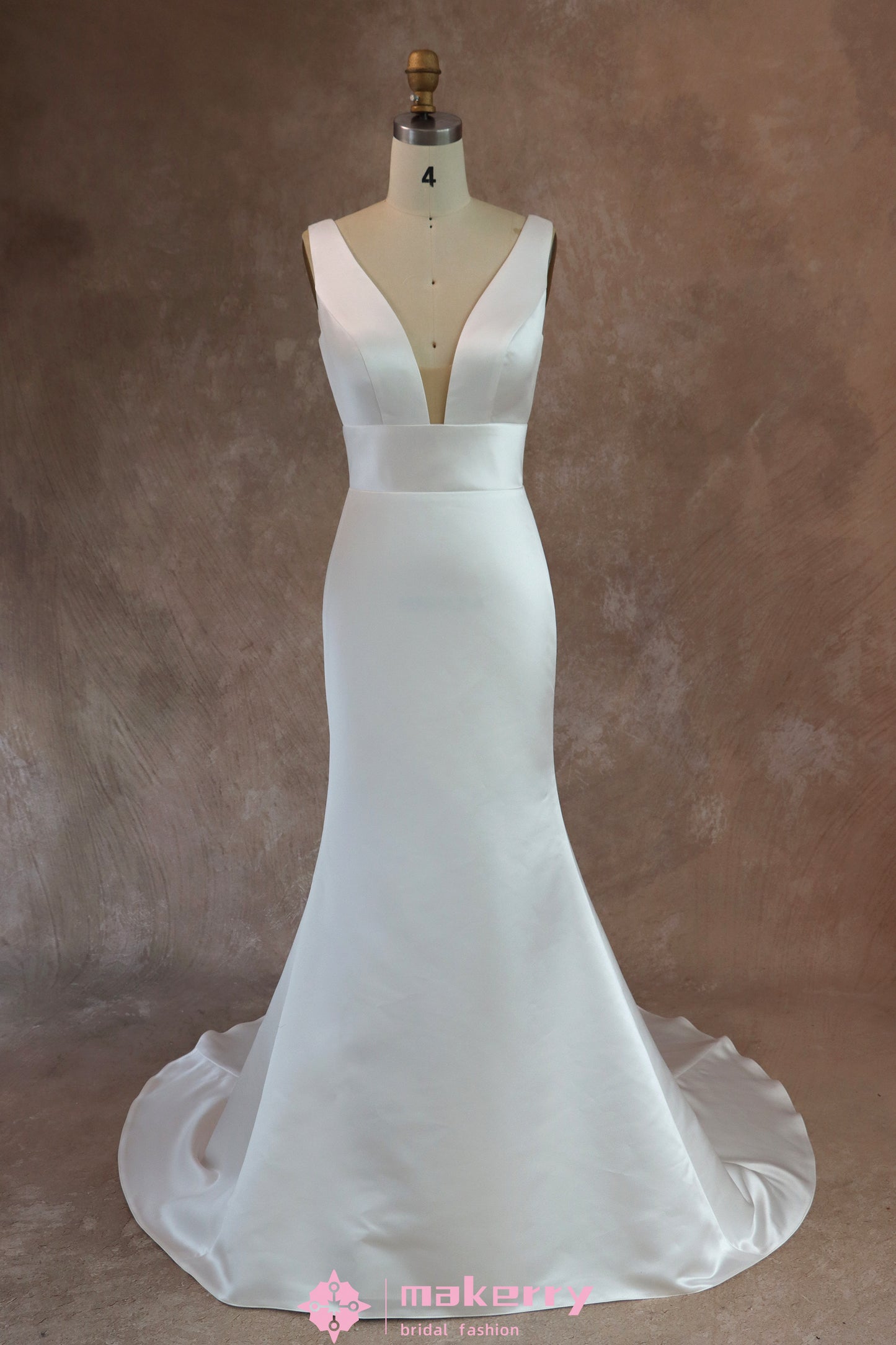 Satin fit and flare gown that feels both modern and classic. Its structured bodice boasts a plunging illusion neckline and supportive shoulder straps. Sleek skirt with a beautiful train completes the look.
