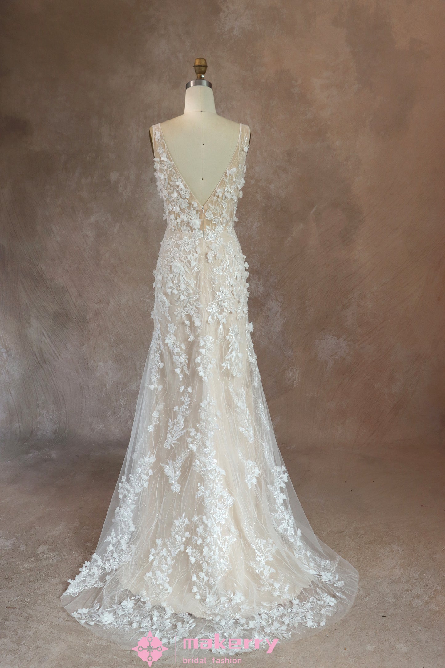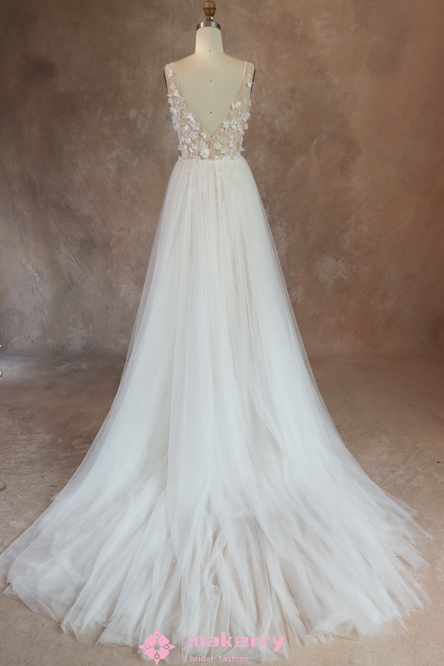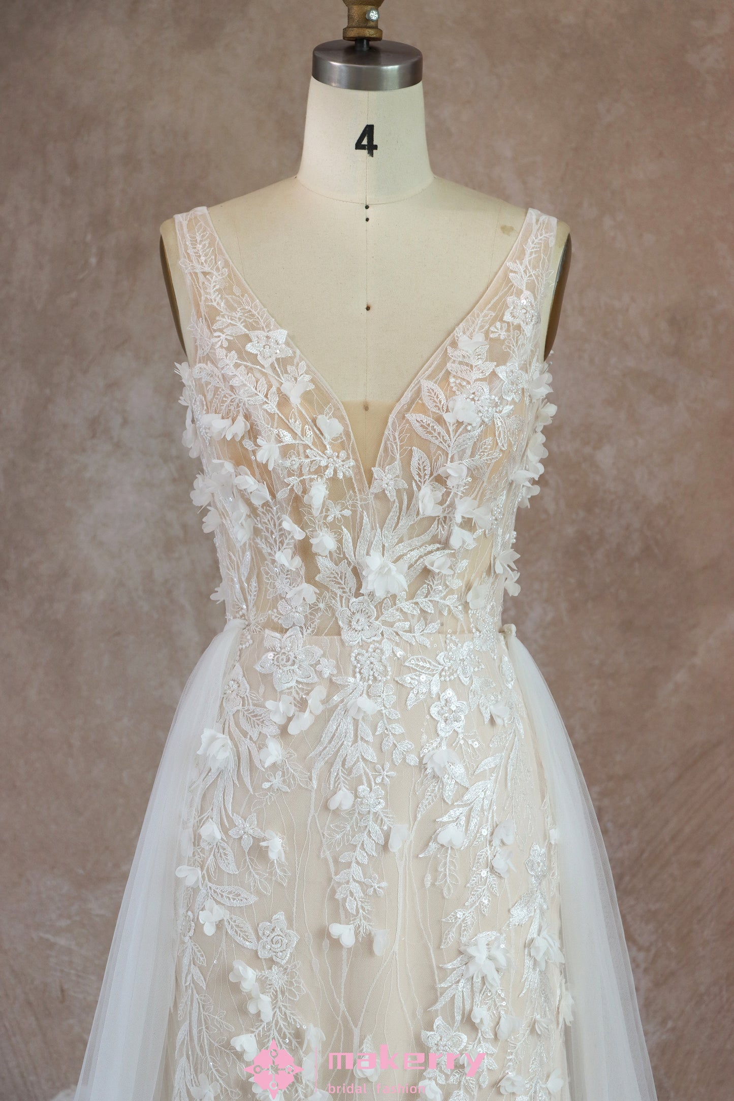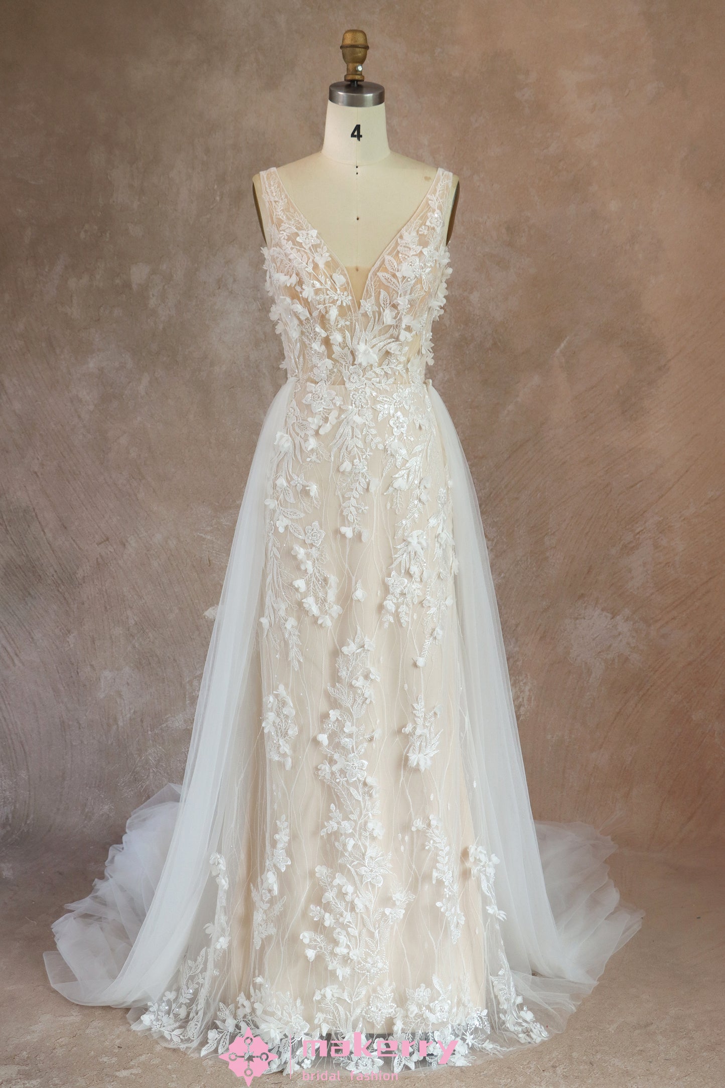 The sexy plunging V-neck is detailed with illusion insets lead to an illusion V-back. 3D flowers lace appliqués add a touch of whimsy from the bodice to the the hem while like a waterfall of tulle acts as the perfect canvas. The detachable skirt making this dress romantic from head to toe.
