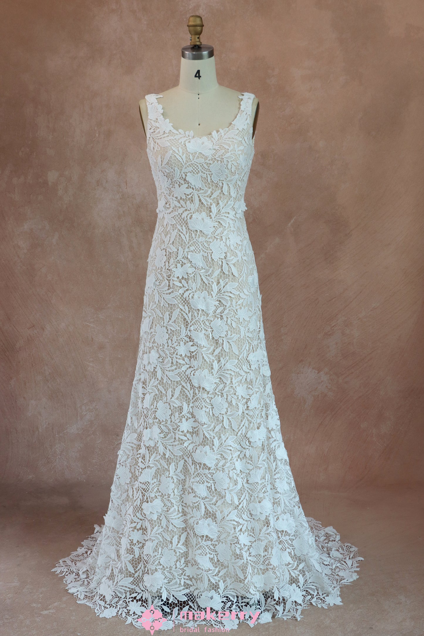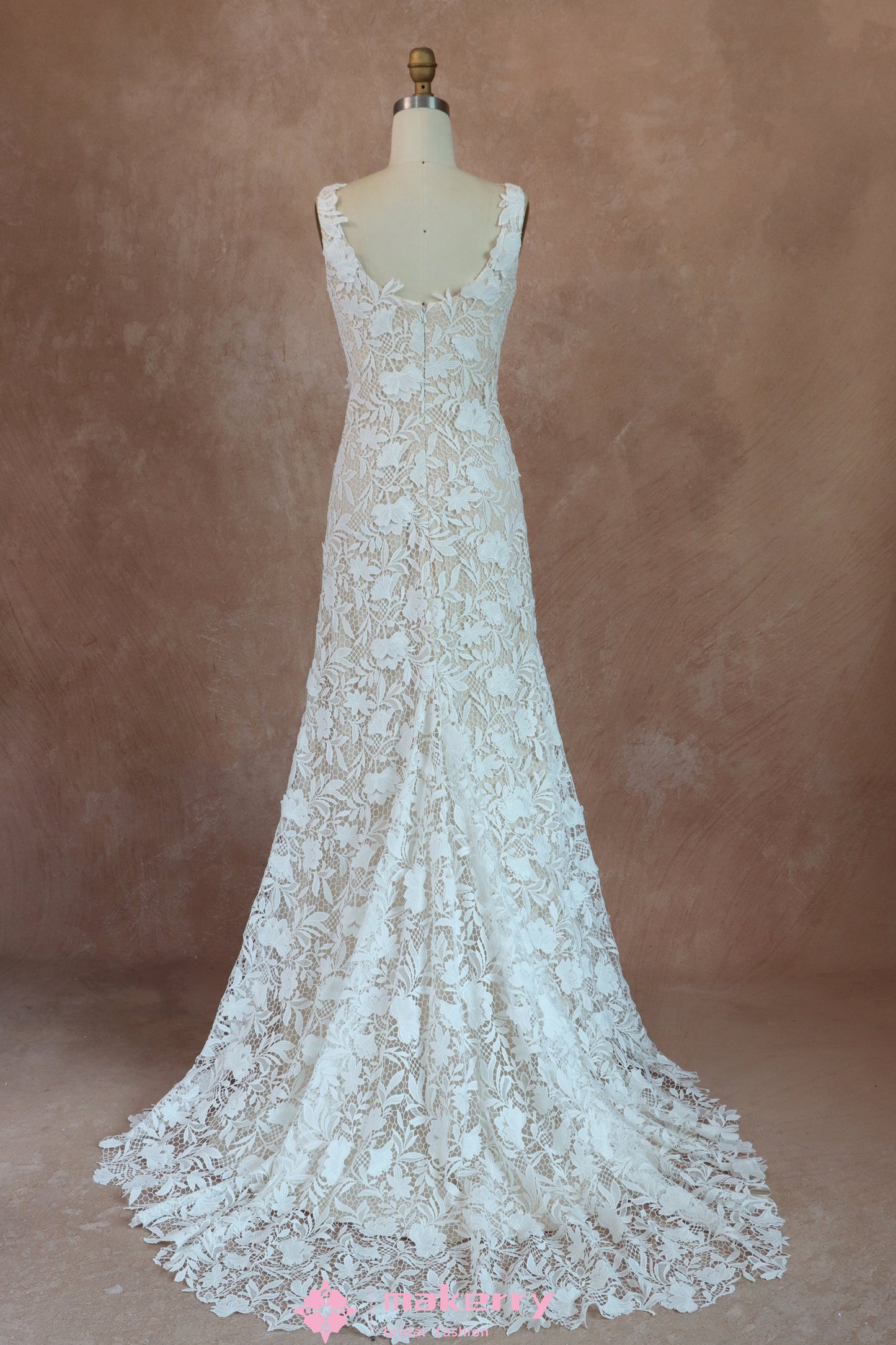 Elegant Three-Dimensional Floral Lace Wedding Dress With Bateau Neckline