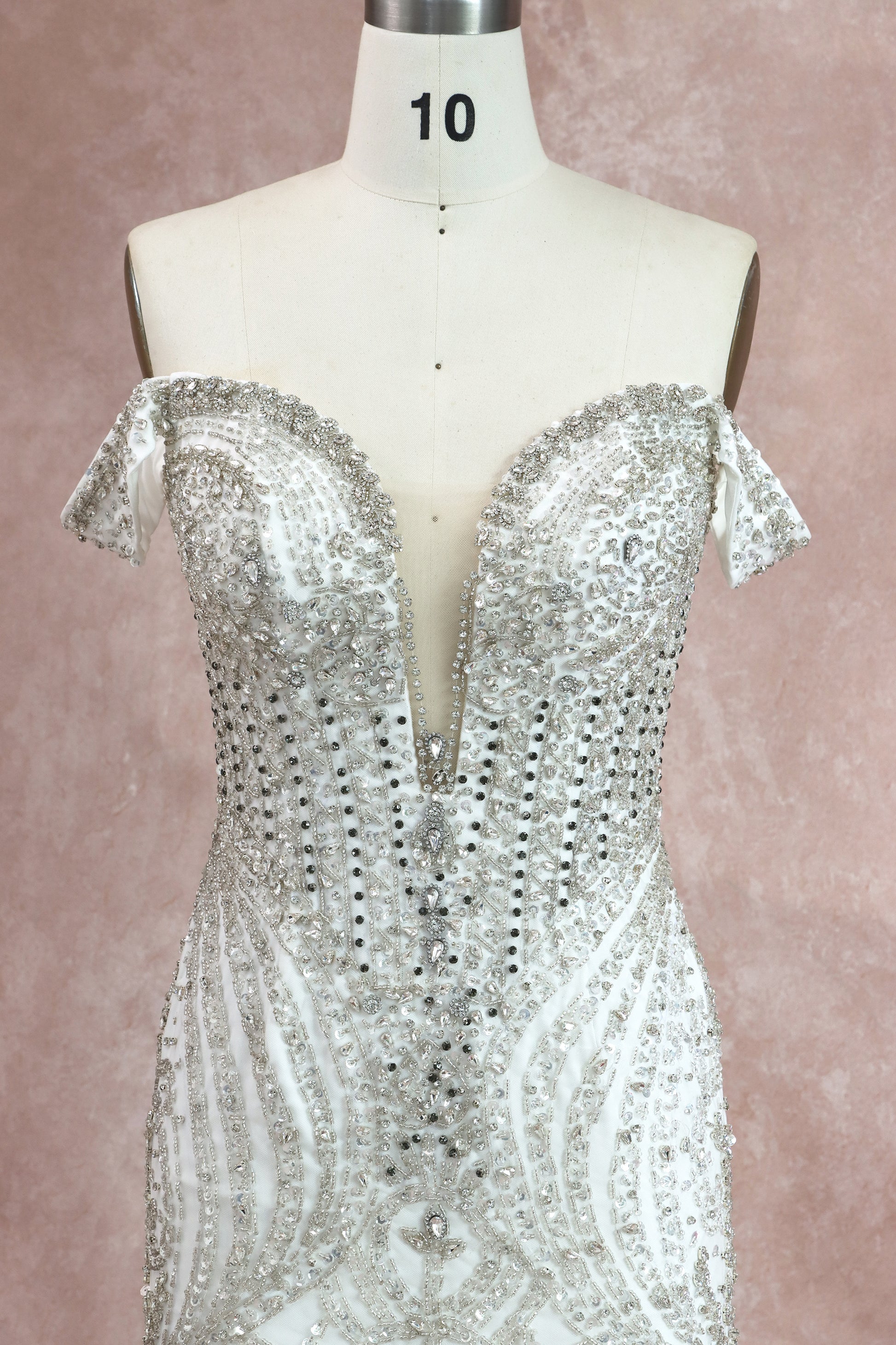 This dress is designed to flatter your figure. The intricate crystal beading adds a touch of glamour, while the ruffle tulle mermaid skirt exudes romance and sophistication. Perfect for the modern bride seeking a timeless and refined look.
