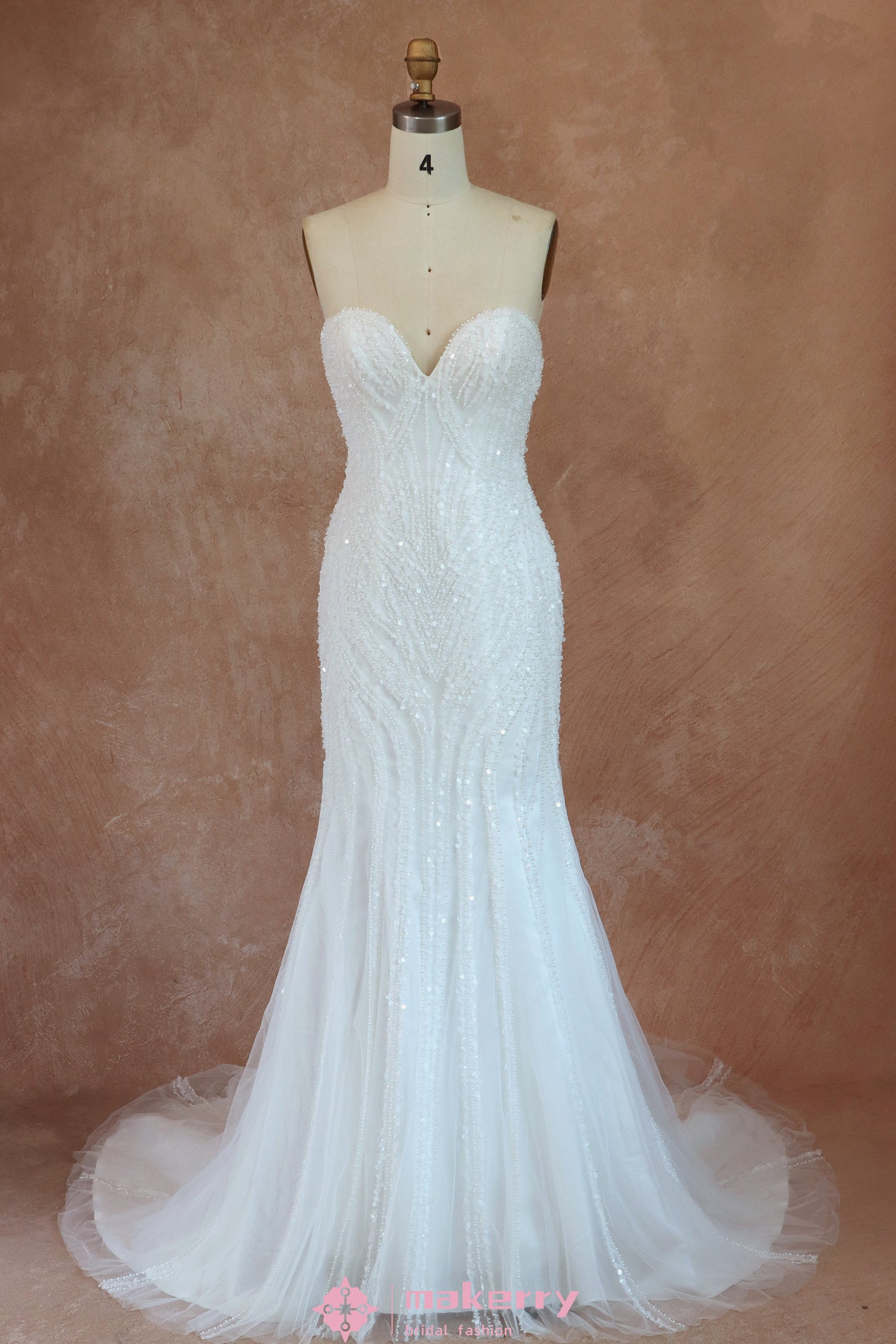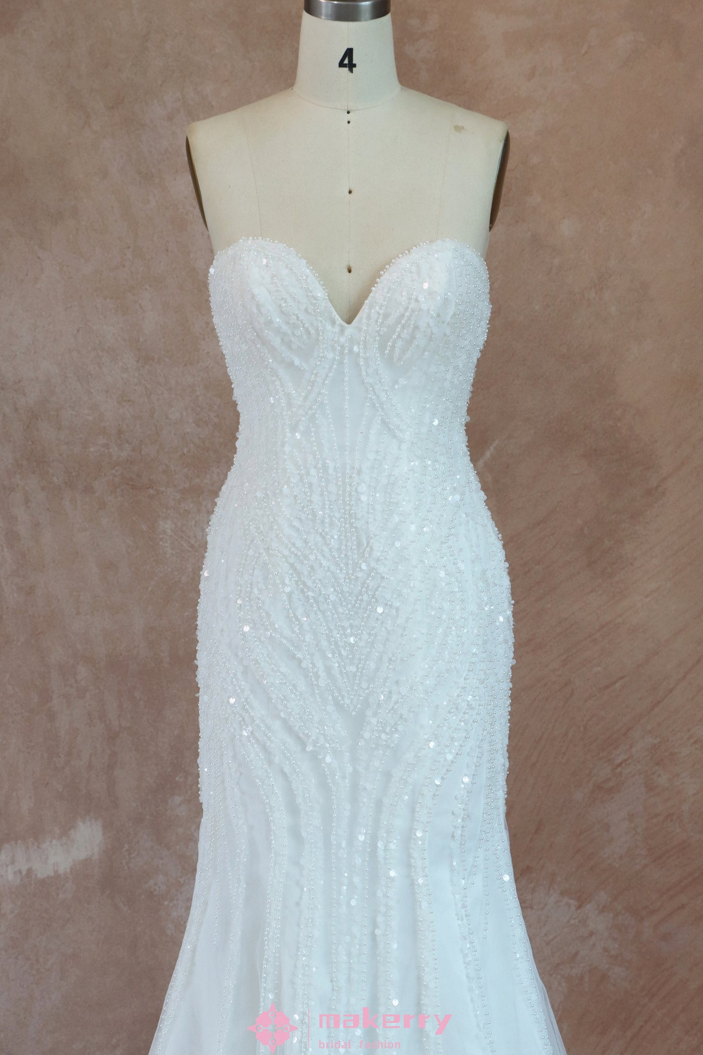 Luxurious mermaid-inspired beaded wedding gown. This mermaid-inspired beaded wedding gown is chic, shimmery, and dance floor-ready.