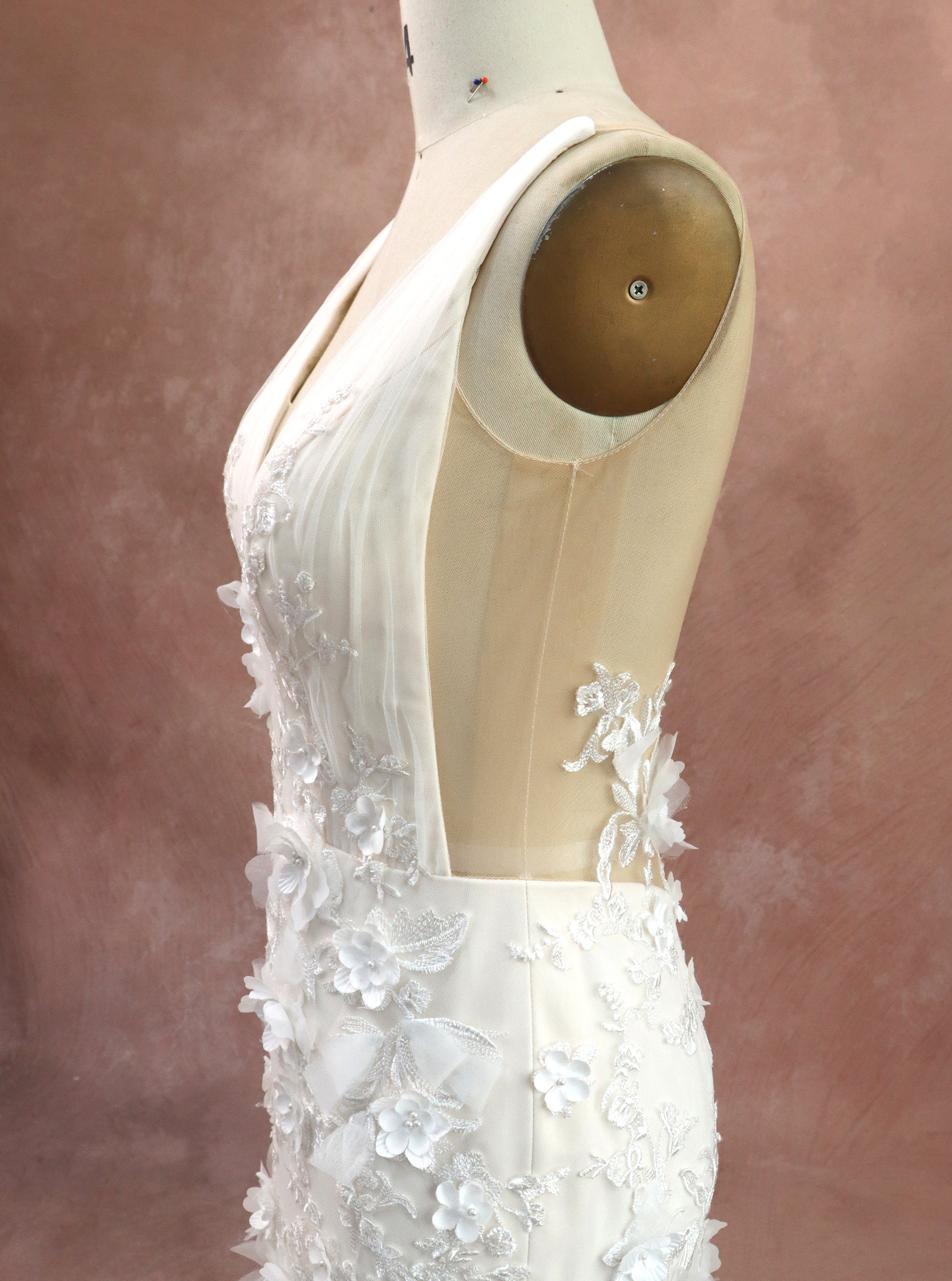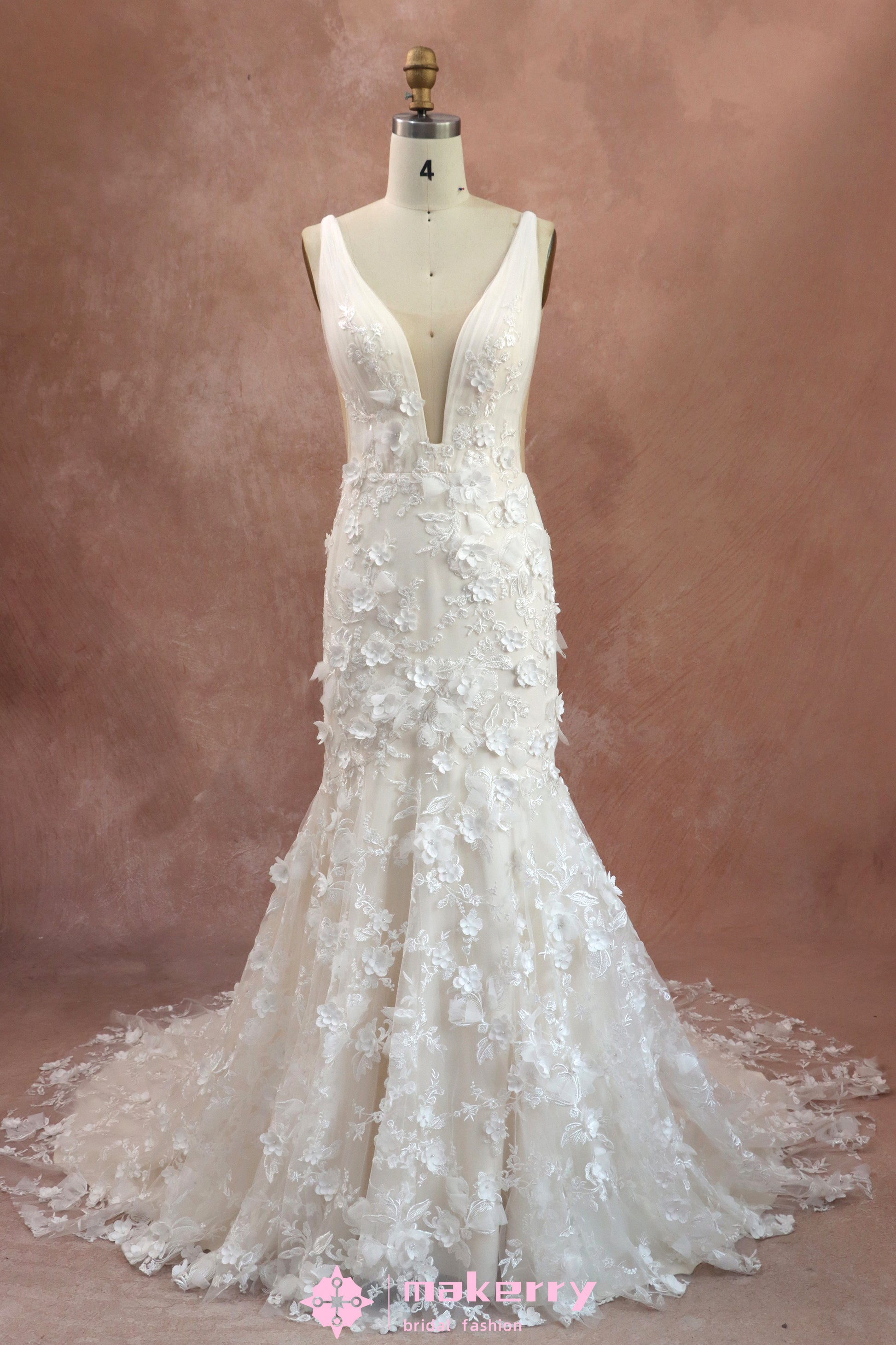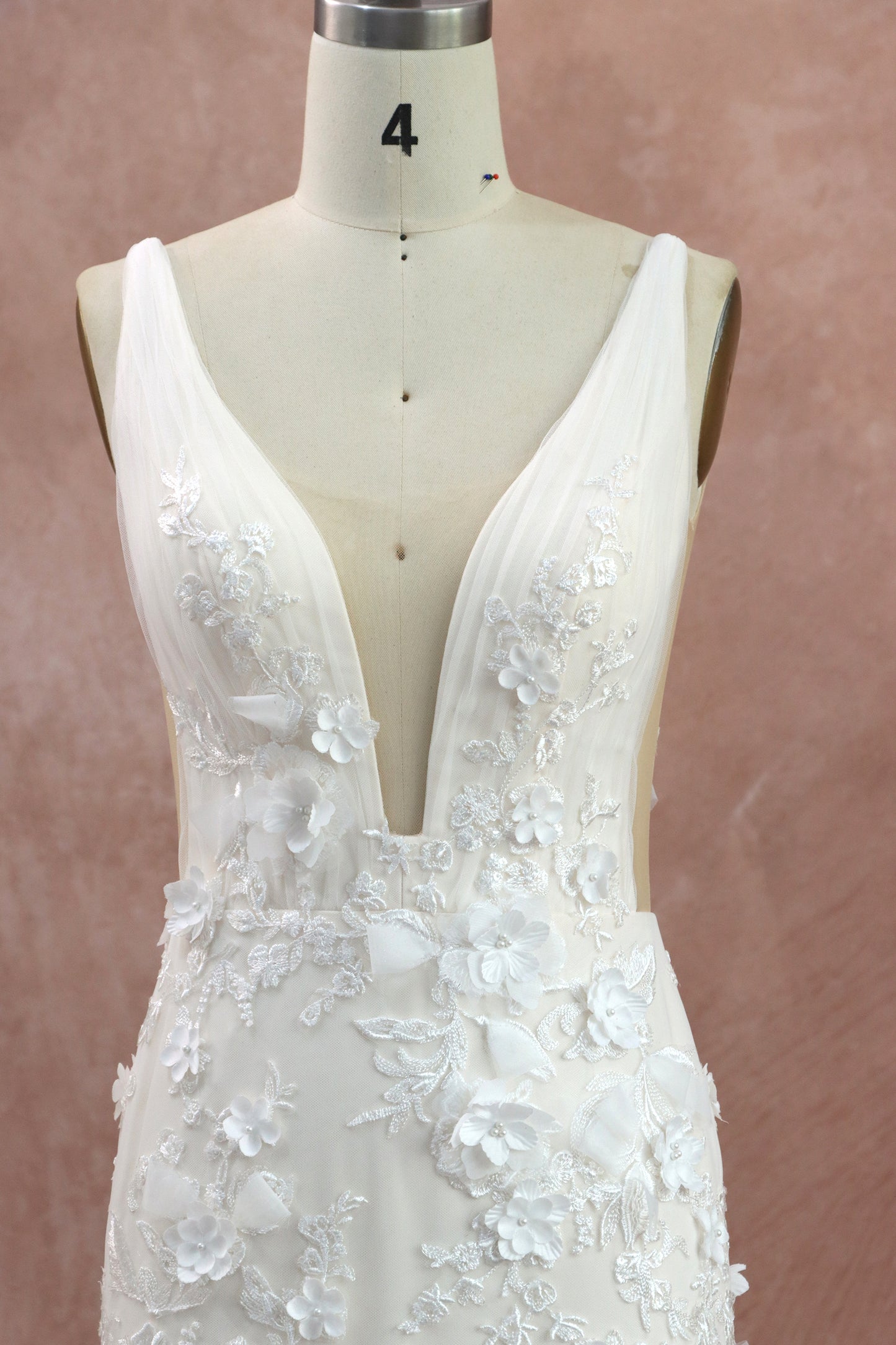 3D Flowers Lace Wedding Dress With Deep V-neckline