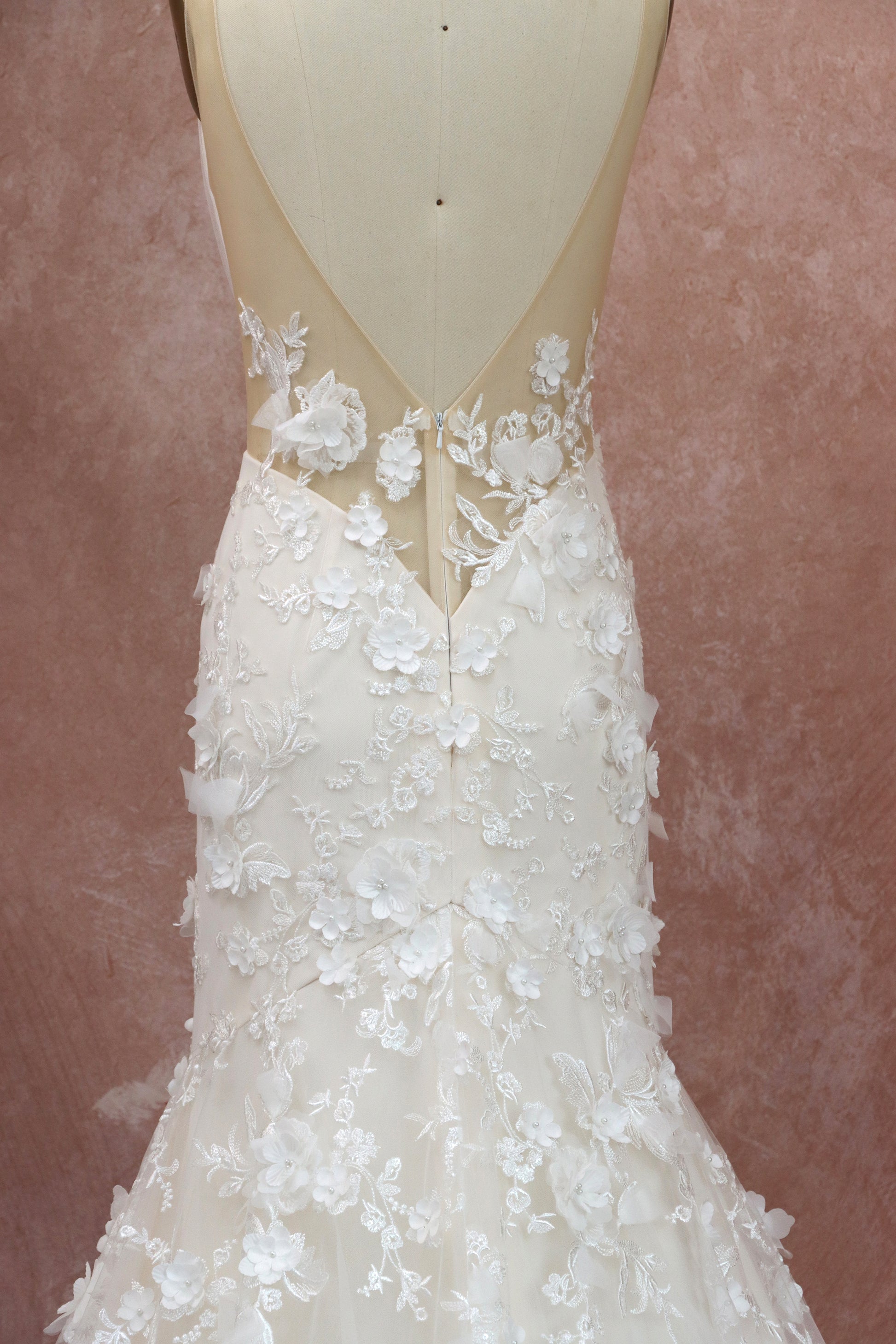 This romantic lace wedding gown features a deep V-neckline with long tulle ribbon climbing on the shoulders. Beautiful 3D flowers on the full lace train.