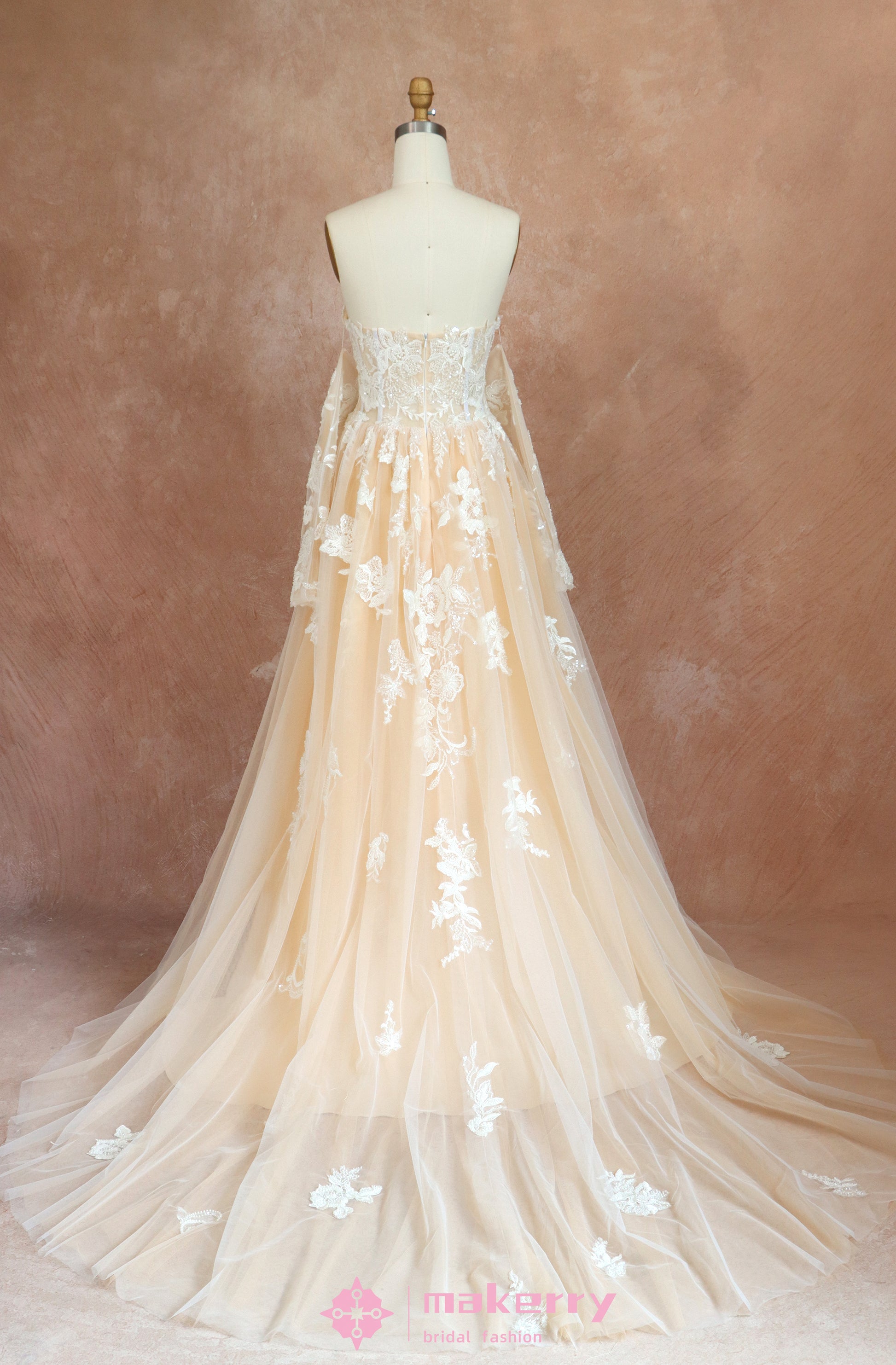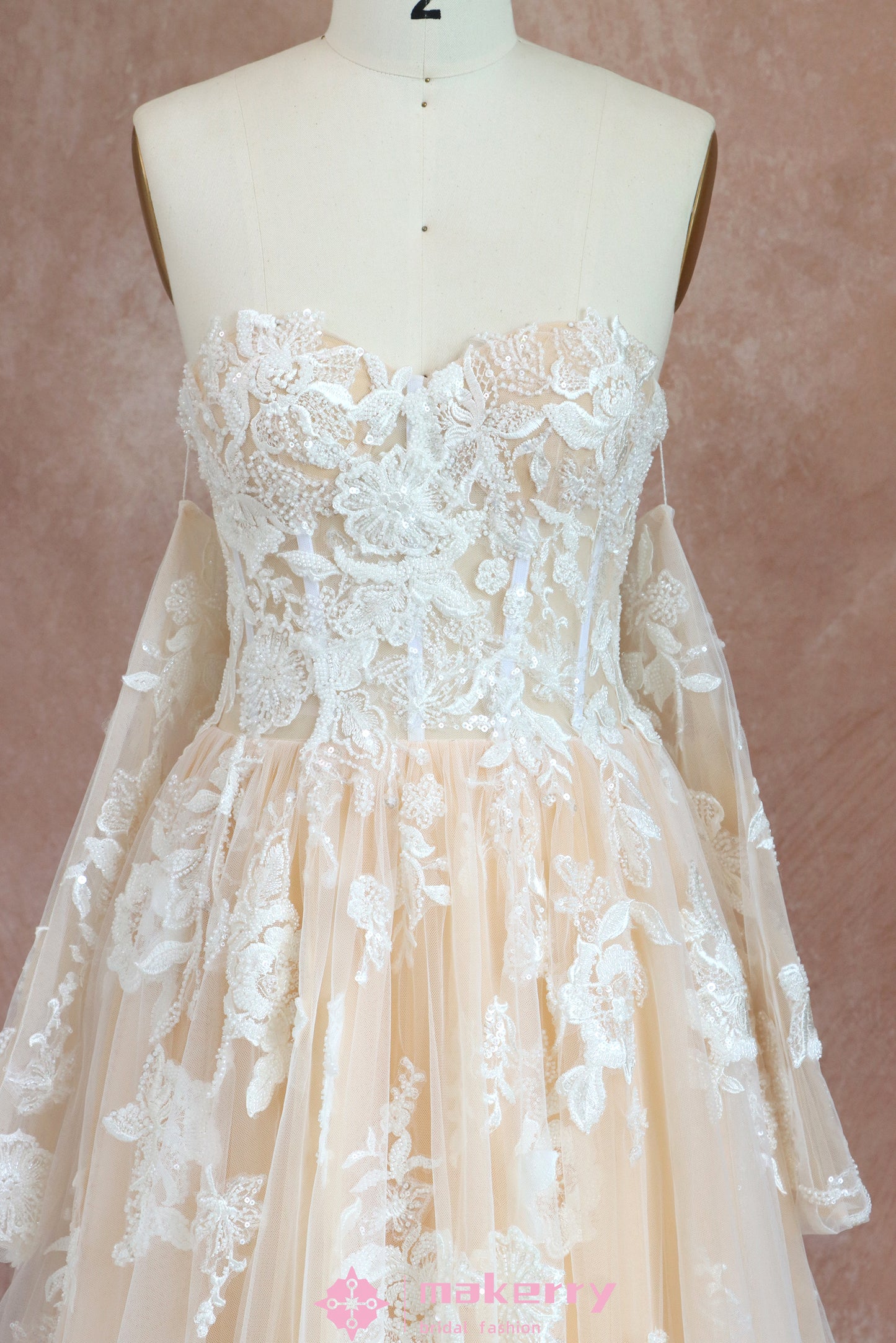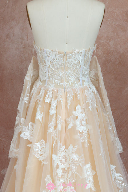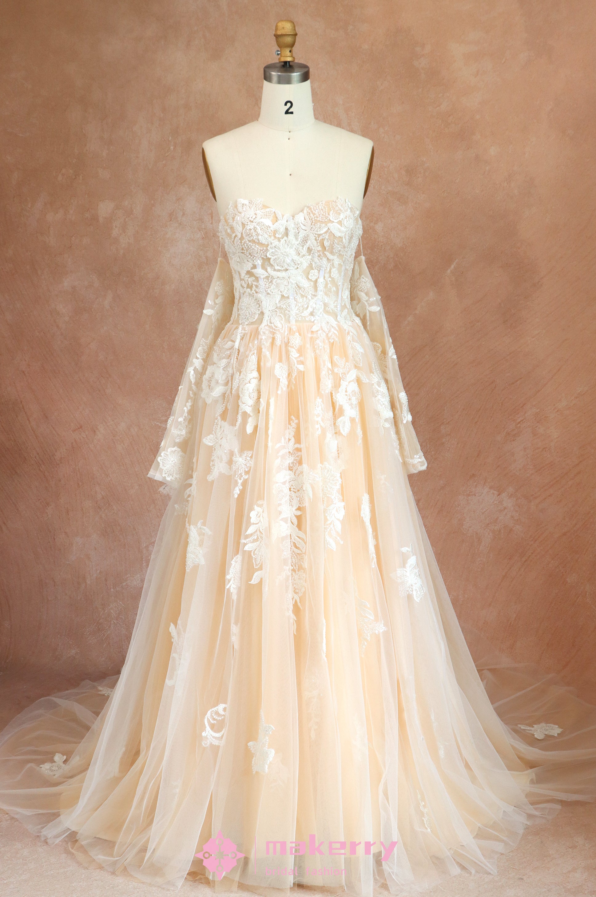 Floral Appliqué Wedding Dress with Sheer Long Sleeves