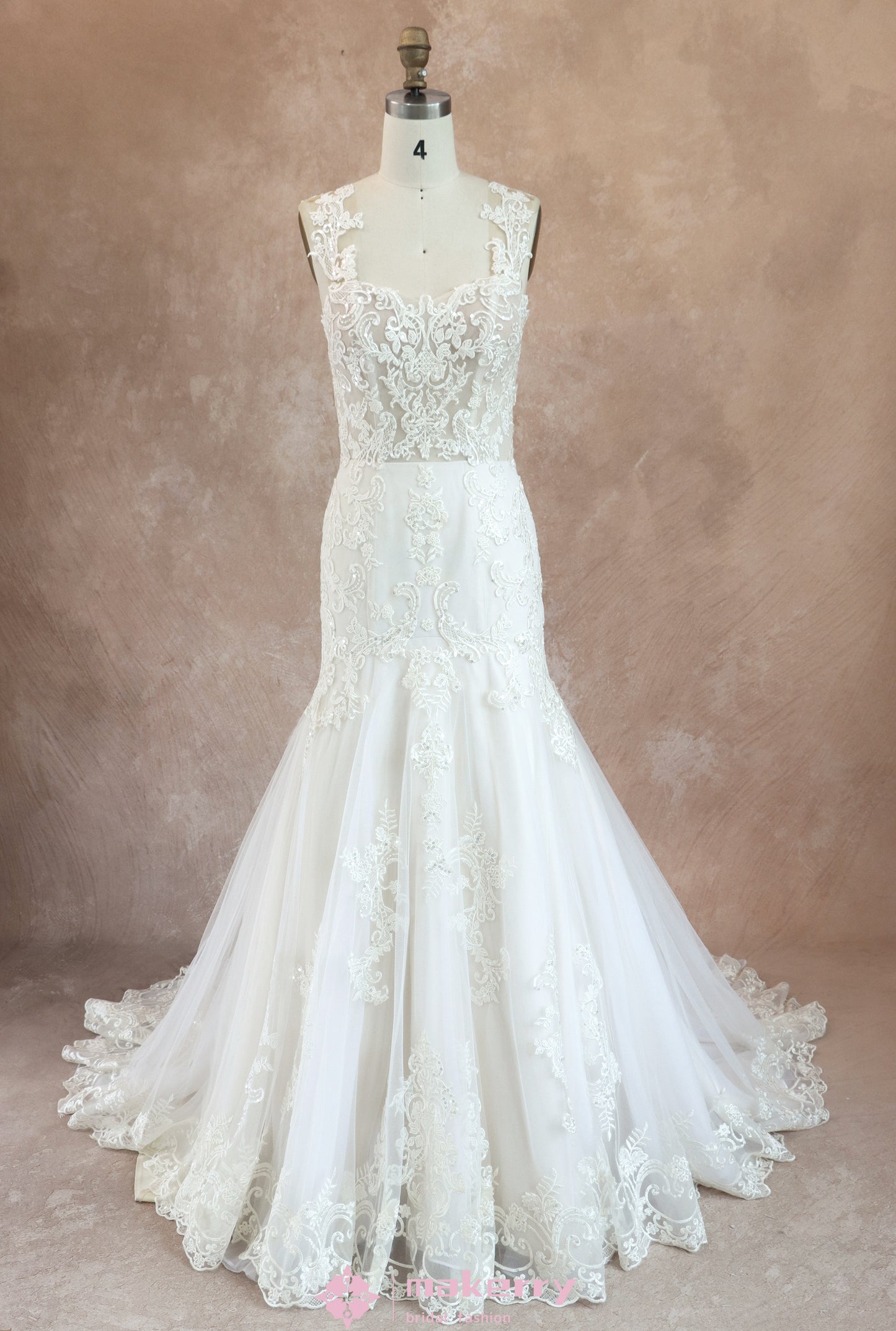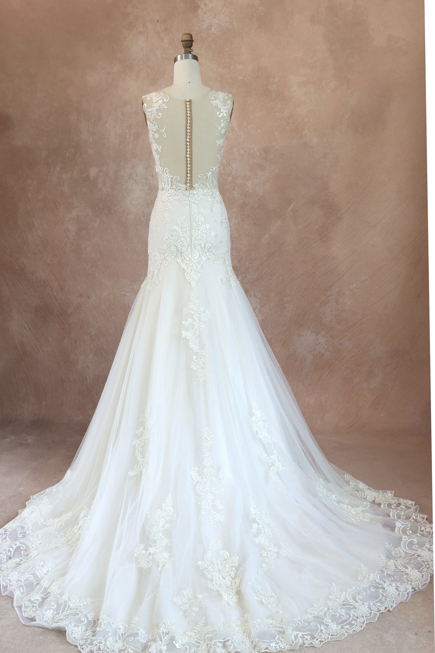 A sheer bodice with sweetheart neck and buttons-up back embodies subtle sexy. The wow-factor is all in the details, with graphic laces with fine sequins, pearls forming symmetrical patterns throughout the mermaid bridal dress that contour the figure beautifully. Long train.