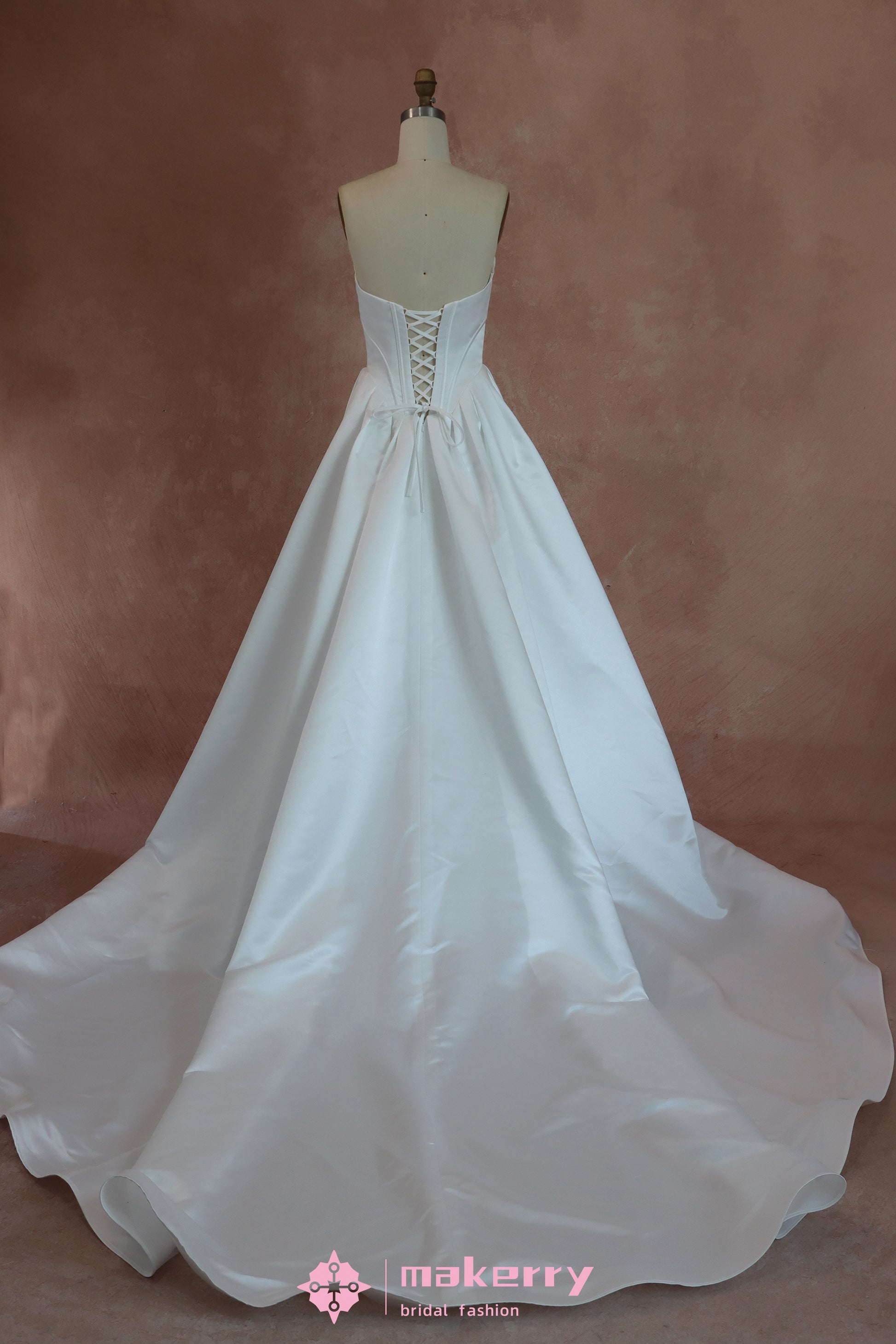 Deep round neck corset with pointed bottom and voluminous smooth fabric skirt. Offering brides a timeless allure with her clean lines design. Crafted with exquisite attention to detail, this satin A-line wedding dress features a sophisticated cat-eye neckline that accentuates the décolletage with subtle allure.