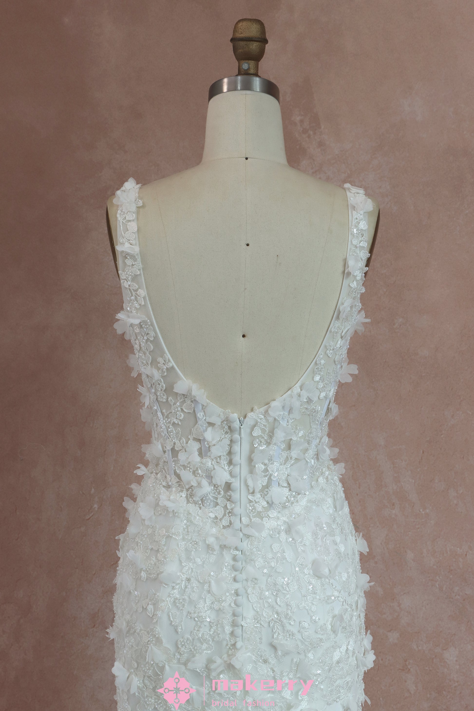 This wedding gown is a stunning blend of contemporary elegance and bridal enchantment, designed for the bride who seeks sophistication with a touch of allure. Intricate bead detailing and soft 3D floral petals are carefully placed throughout, adding texture and depth to the gown. This gown perfectly contours the body, with a flattering basque waist and a soft sweetheart neckline that gracefully frames the décolletage.