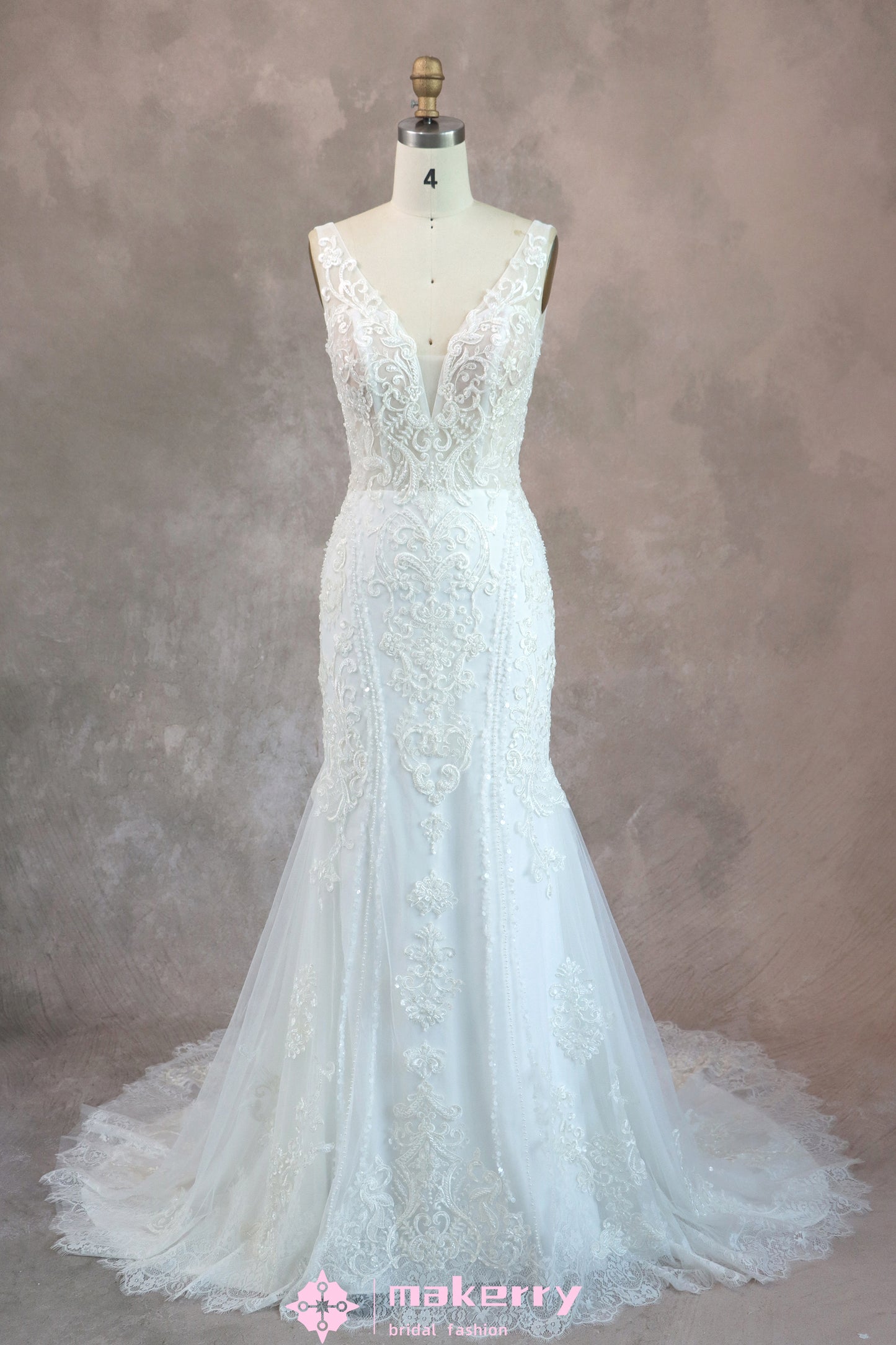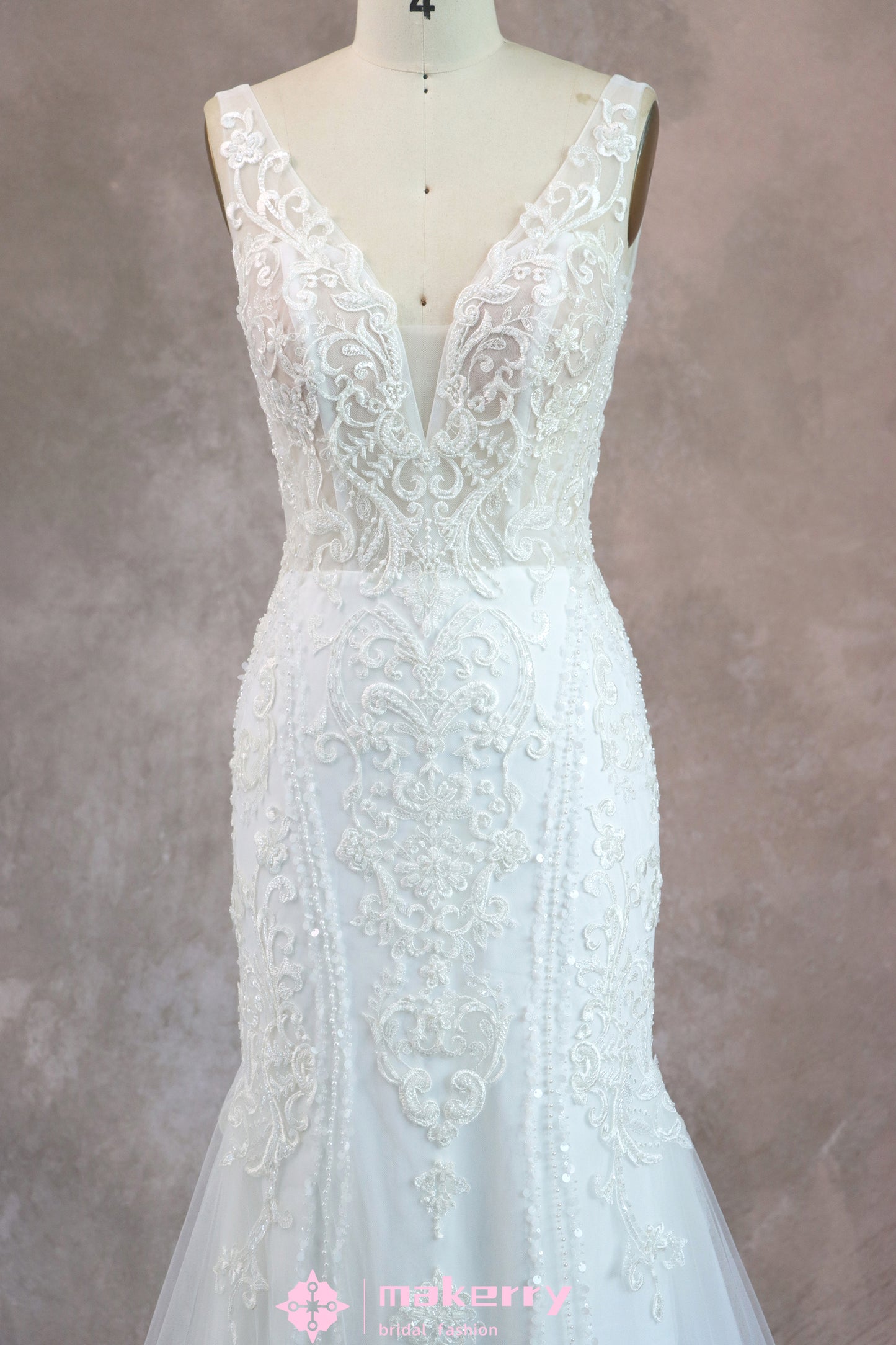 Look for a shimmery lace mermaid wedding gown. Adorned with intricate beadwork with plunging neckline, it captivates with every glance. The exquisite skirt, embellished with scattered lace appliques, cascades gracefully, adding a touch of romance to its already mesmerizing design. lovely, luxe, and star-like bridal dress will have you singing from the rooftops.